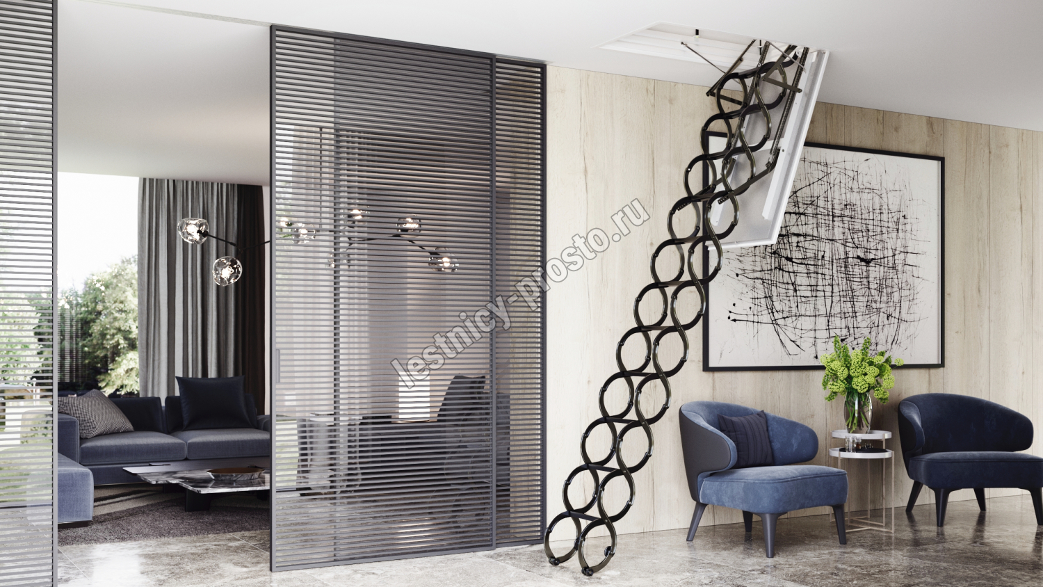 Сертифицированная, противопожарная лестница, огнестойкость: EI1 20 / EI2 60 / EW 60. Лестница чердачная, раздвижная, ножничного типа, работает по принципу сжатия. Крышка лестницы представляет собой многослойную конструкцию – деревянная рама, внутри которой находится теплоизоляция и противопожарная вставка. Внутренняя часть крышки покрыта оцинкованной жестью, наружная часть белой эмалью и защитной пленкой. Толщина крышки 60мм. Лестница предназначена для установки в утепленное чердачное помещение, где колебание температуры не превышает 10 градусов. Все соединяющие части изготовлены из твердого материала и имеют оцинкованное покрытие. Короб металлический высотой 140мм. по периметру проходит уплотнитель.