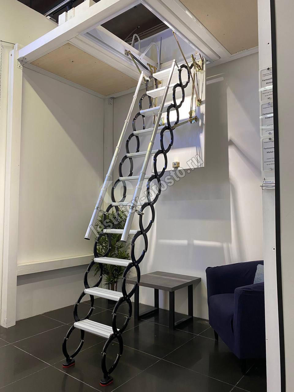 Ступени лестницы – из алюминия (белого цвета). Размер ступени 38х14 см