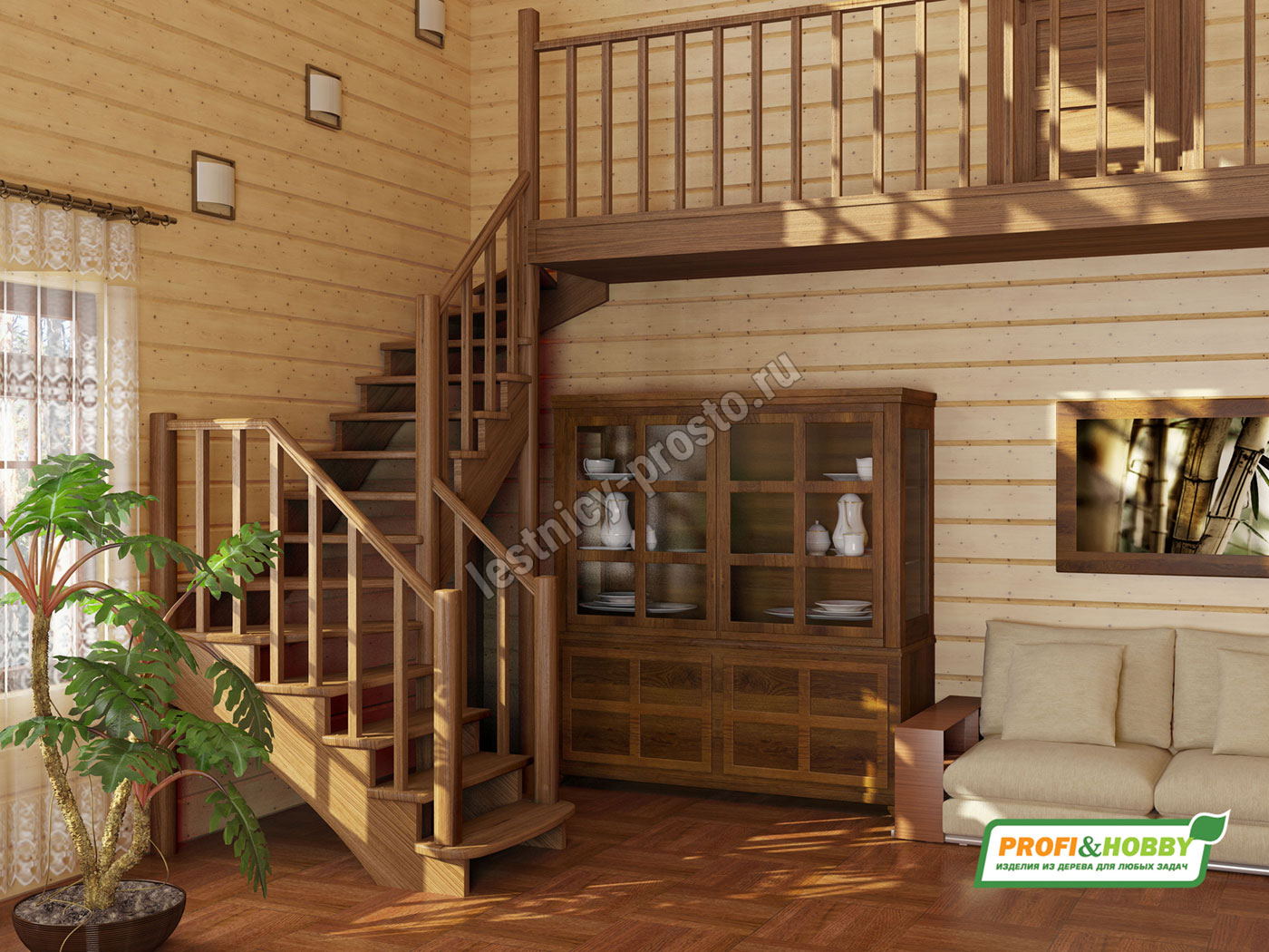 Ступени и поручень лестницы выполнены из дуба, остальные элементы из сосны. Возможно изготовление данной модели полностью из дуба.