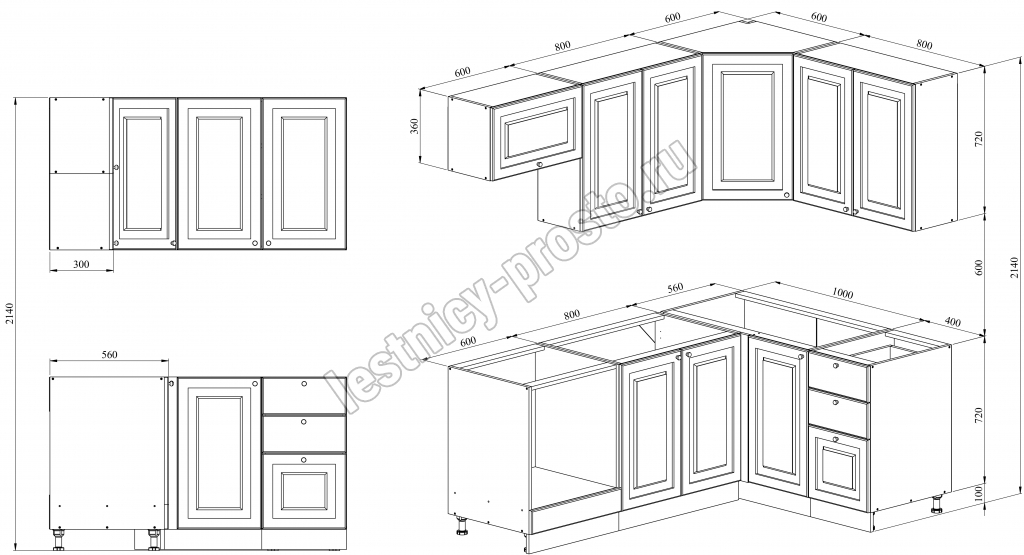 Угловой кухонный гарнитур из 100% массива сосны размером 2 на 1,4 и высотой 2,14 метра (верхние шкафчики 72 см). Благодаря модульной системе такая кухня может быть собрана зеркально, а, например, верхние шкафчики "под стекло" и "глухие" заменены местами. В стандартной комплектации нижние тумбы оснащены регулируемыми ножками высотой 100 мм и цоколем из массива сосны 95 мм.