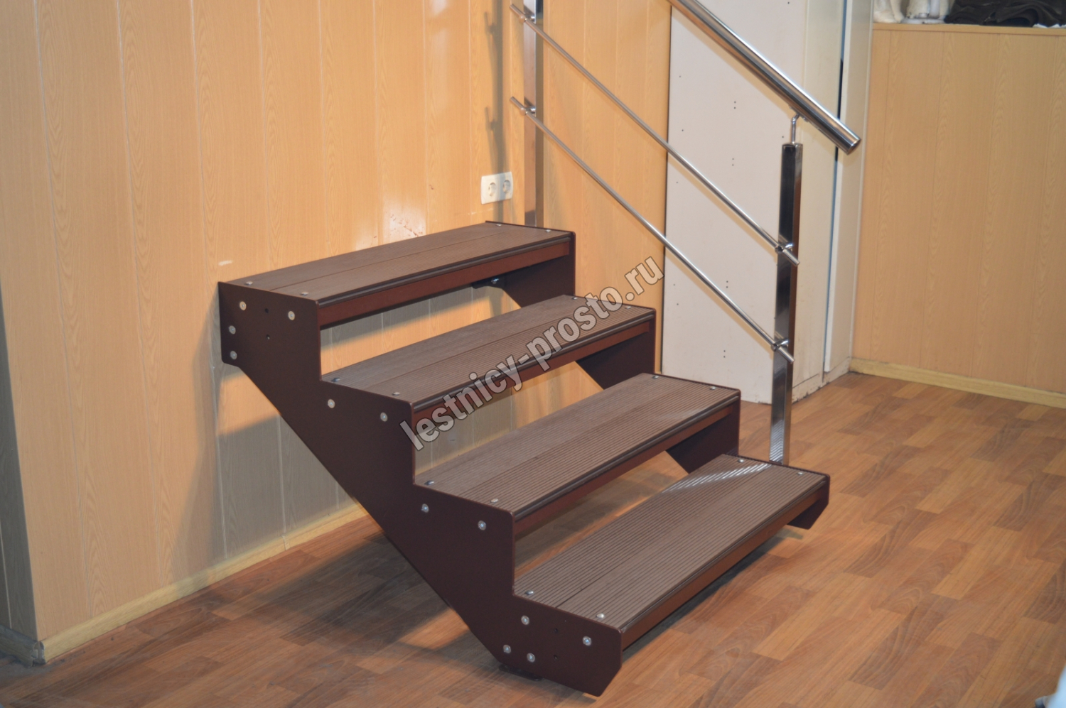 Ступени лестницы состоят из металлической рамки, обеспечивающей необходимую прочность, и покрытия из террасной доски ДПК (древесно-полимерный композит). Ступени не боятся воды и мороза, не теряют со временем свой внешний вид и не требуют ухода.