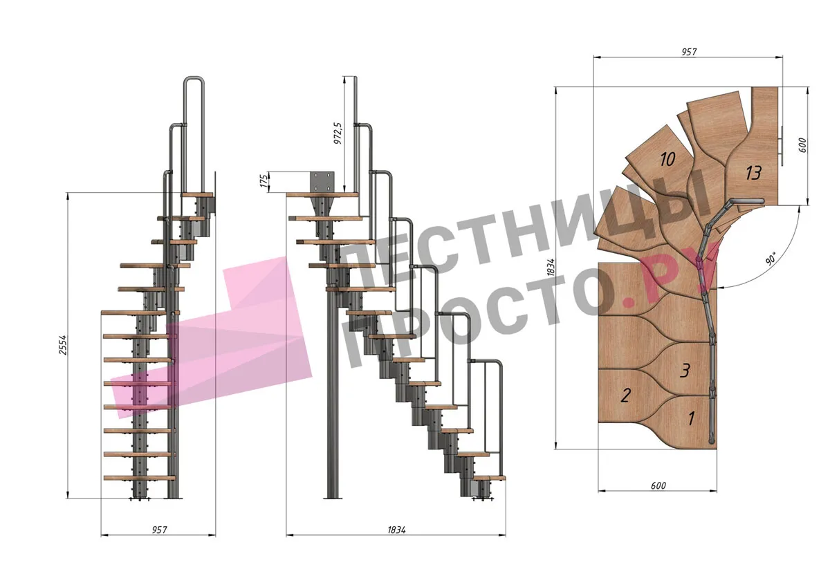Лестница Prosto Urban Black гусиный шаг 600 мм, h234-336 см (13 ступеней), бук