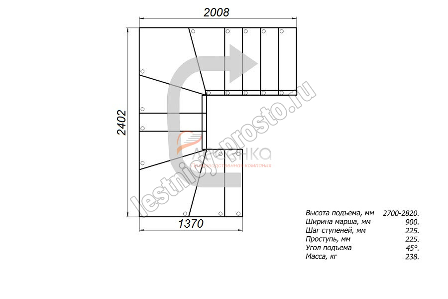 Модульная лестница Спринт 225 2700-2820, Серый, Лиственница, Нержавеющая сталь