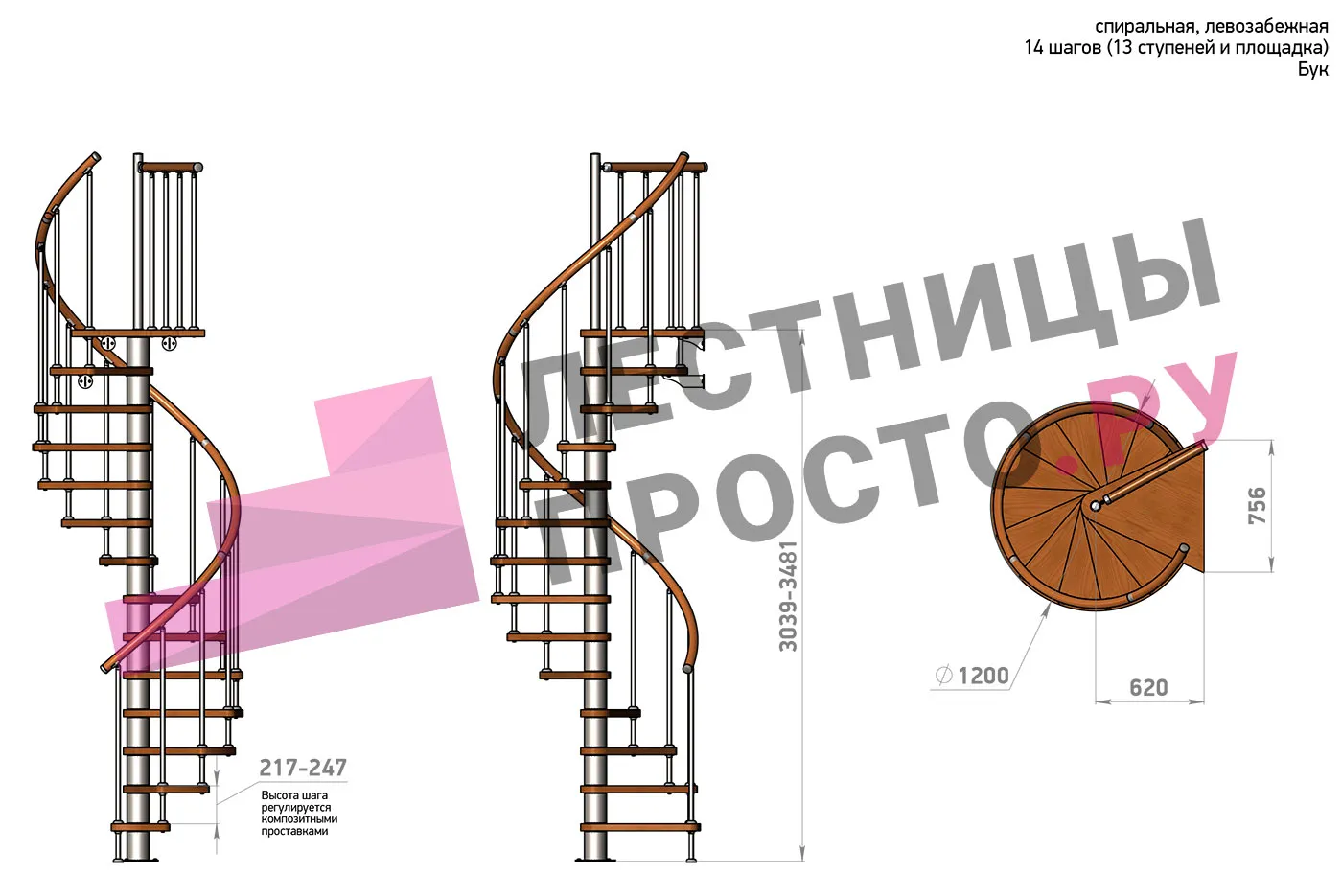 Решение о направлении поворота принимается при сборке лестницы - универсальная конструкция позволяет собрать правозабежную и левозабежную лестницы. Высота ступеней регулируется с шагом 3 мм. в пределах 217-247 мм., благодаря чему, лестница прекрасно подгоняется под необходимую высоту.