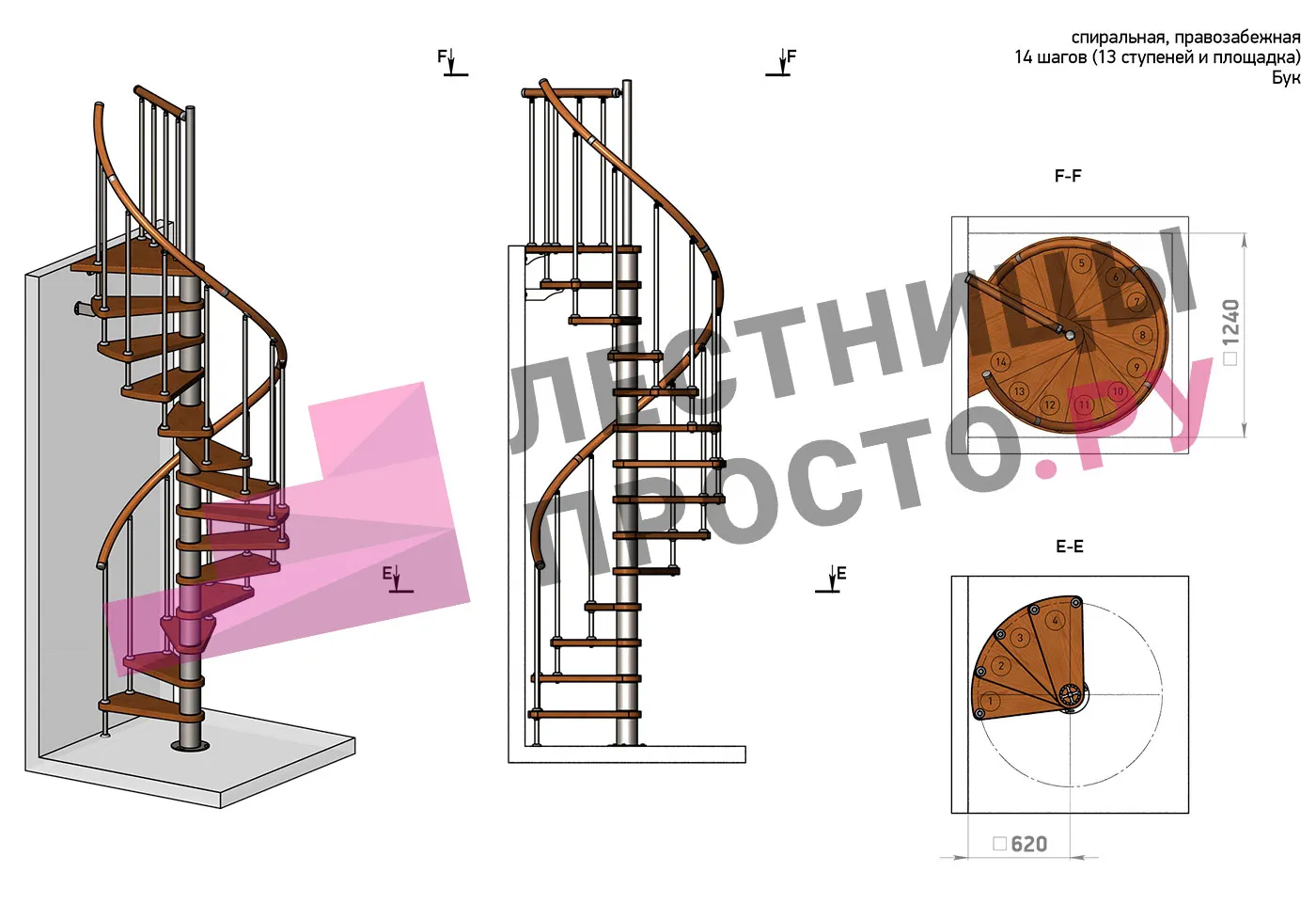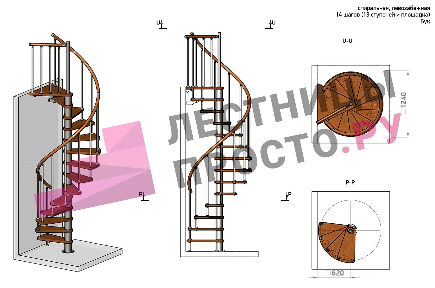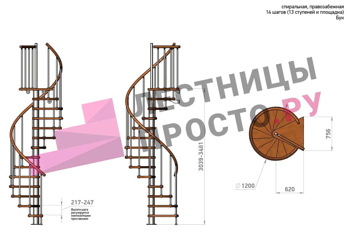 Винтовая лестница Prosto Spiral White D120см, h303.9-348,1 см, бук