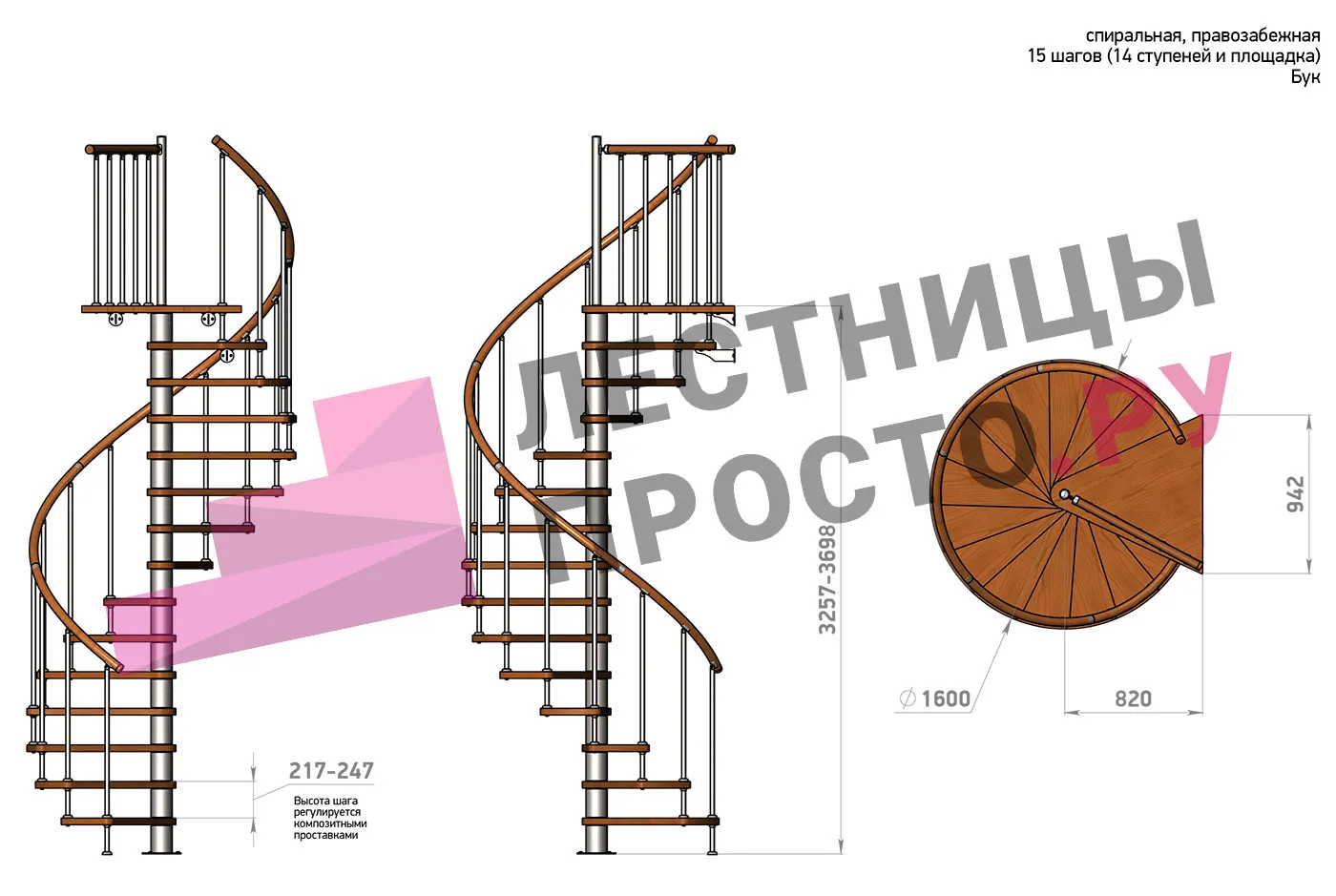 Винтовая лестница Prosto Spiral White D160см, h260.5-304.6 см, бук |