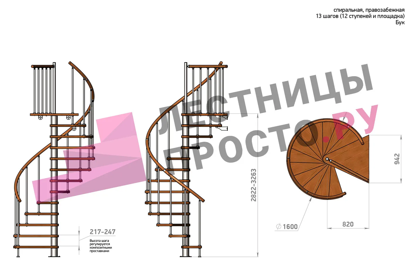 Винтовая лестница Prosto Spiral White D160см, h282.2-326,3 см, бук |