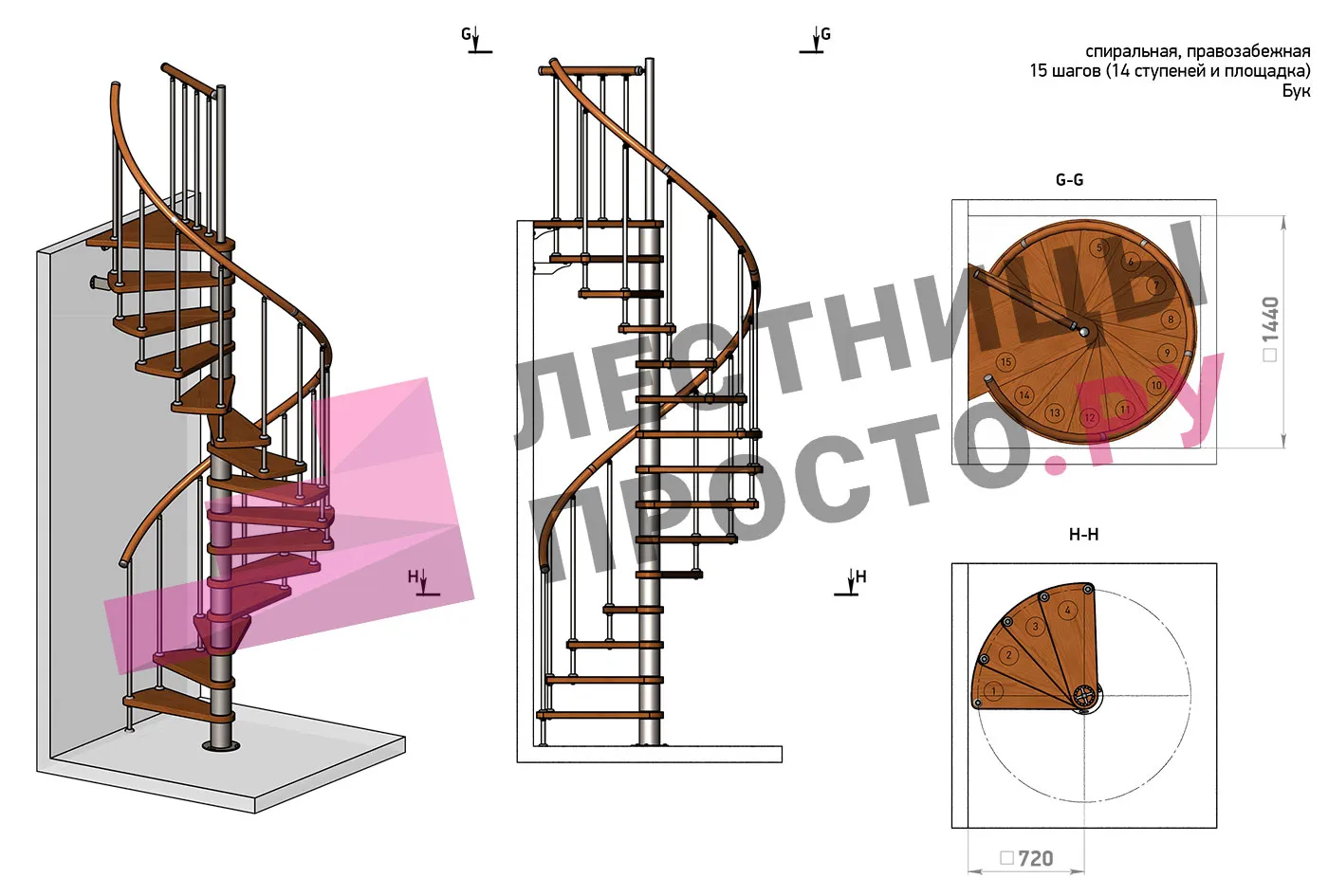 Винтовая лестница Prosto Spiral White D140см, h303.9-348,1 см, бук |
