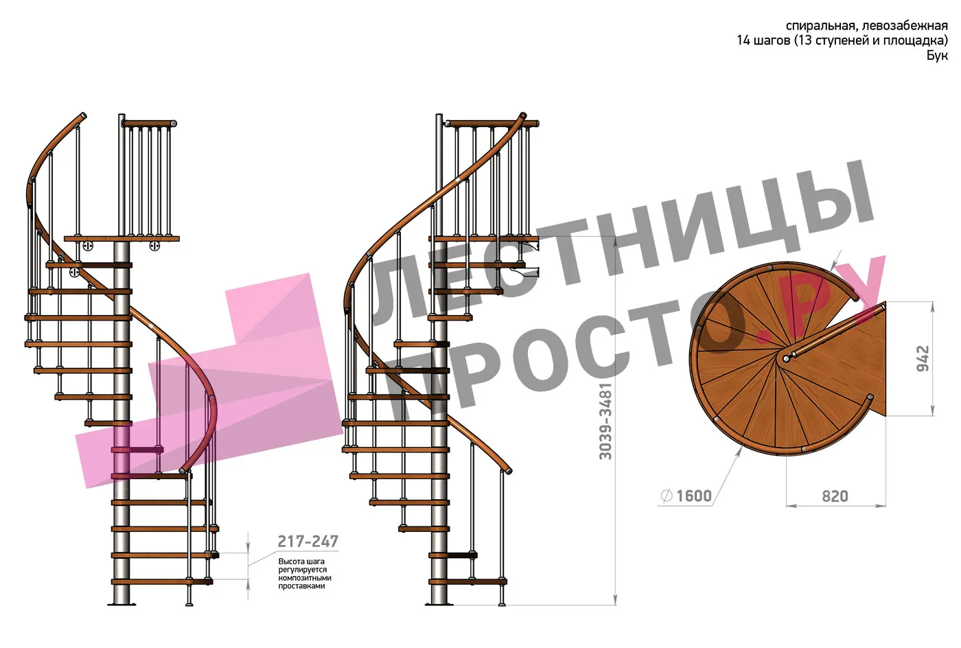 Винтовая лестница Prosto Spiral White D140см, h260.5-304.6 см, бук |