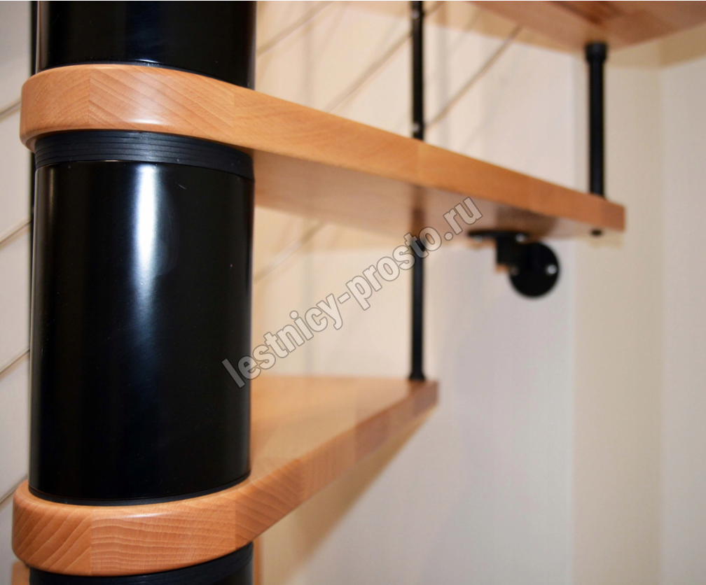 Деревянные ступени и поручни  изготовлены из массива дерева и покрыты специальным лаком от компании Минка, который предотвращает царапины, сколы или стирание поверхности при интенсивном использовании лестницы.