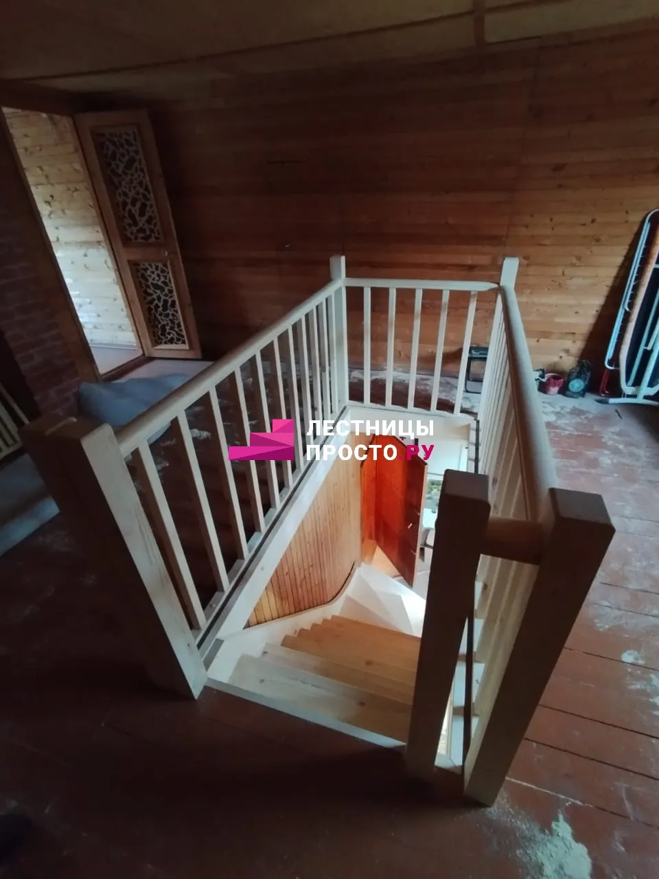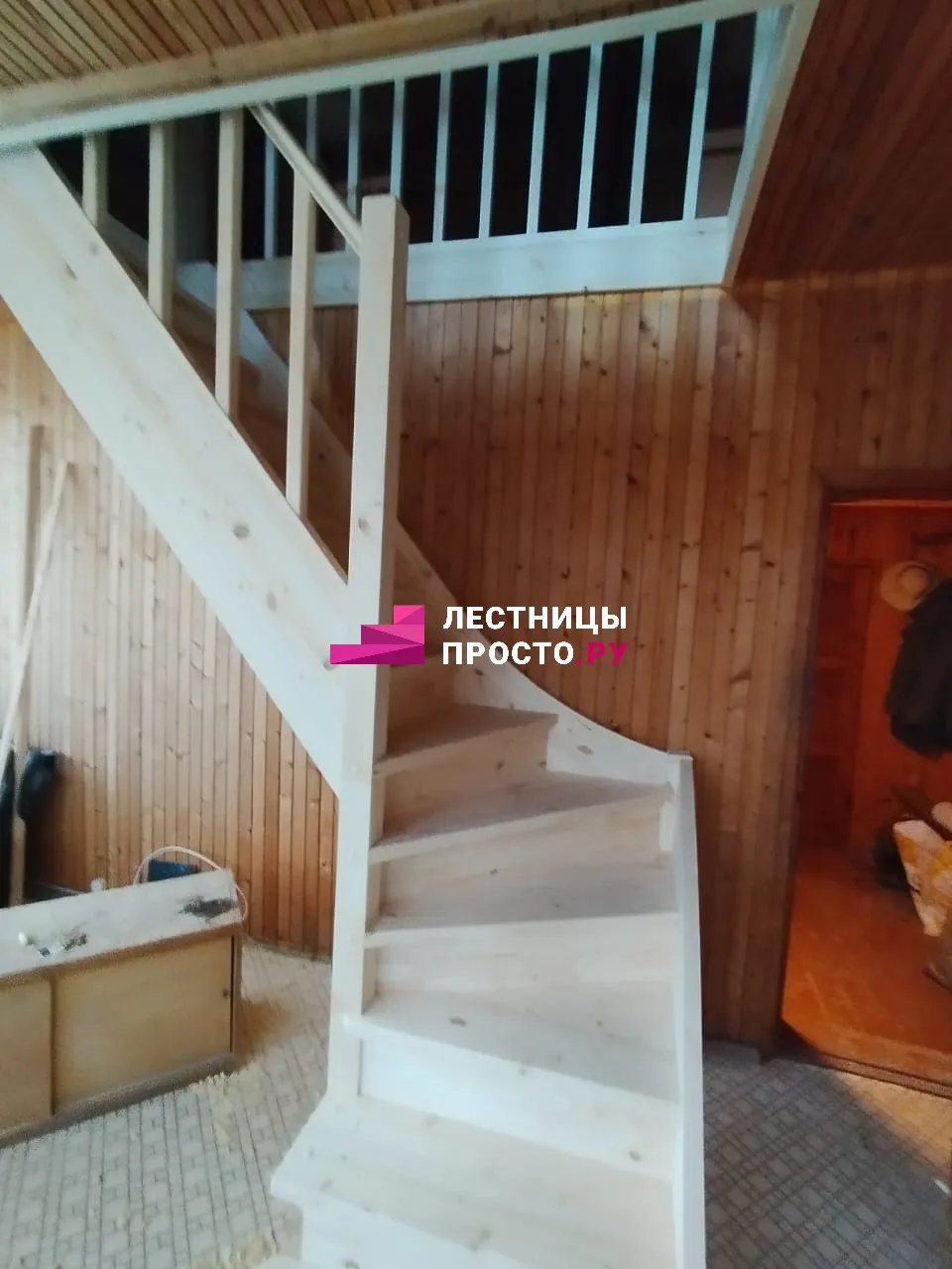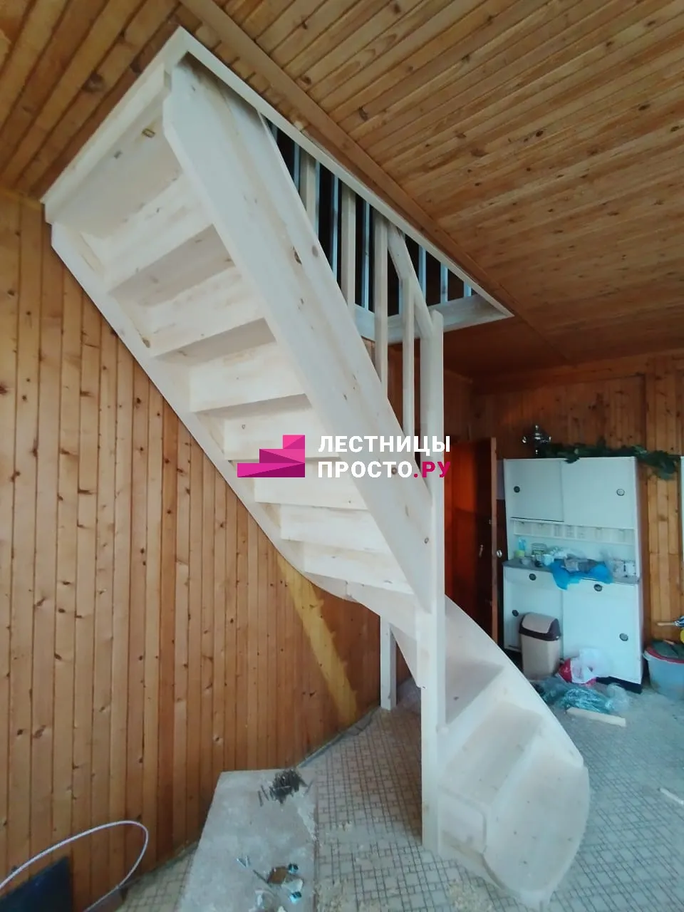 Лестница из сосны с поворотом и подступёнками для частного дома